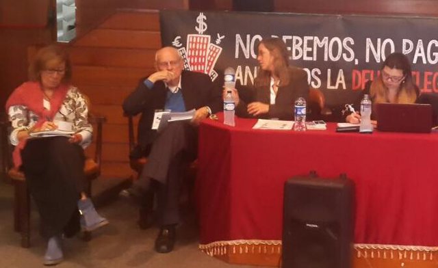 François Houtart (2 e à gauche) lors de la conférence du CADTM à l'université à Bogota le 24 avril 2017