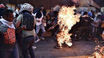 En cent jours de violences, huit personnes ont été lynchées et brûlées vives par les « manifestants pacifiques », certaines parce qu'elles tentaient de traverser de barricades montées pour empêcher la circulation, d'autres parce qu'elles ont été confondues avec des « infiltrés chavistes » (2). La plupart des assassins reste en liberté vu les défaillances ou la lenteur de la Justice vénézuélienne, voire à cause de la proximité de certains juges avec le projet politique que les États-Unis baptisent « gouvernement de transition ». Les auteurs ou organisateurs d'exactions deviennent, grâce aux médias, des dissidents politiques (3). Par contraste, en ce qui concerne la minorité de victimes blessées ou assassinées par des membres des forces de l'ordre ayant désobéi aux ordres de ne pas tirer - on observe l'arrestation et le jugement immédiat des responsables.