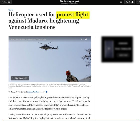 "L'hélicoptère utilisé dans un vol de protestation contre Nicolas Maduro, fait monter les tensions au Venezuela”, titre The Washington Post.
