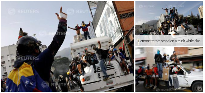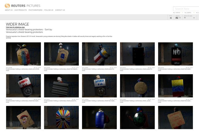 L'album de photos diffusées par Reuters est accompagné d'un commentaire en anglais : « En s'inspirant des révoltes d'Ukraine entre 2013 et 2014, de jeunes manifestants vénézuéliens arborent des boucliers semblables à ceux des Vikings dans leurs batailles contre les forces de sécurité, alors qu'ils regardent avec impatience un film sur les soulèvement de Kiev ».