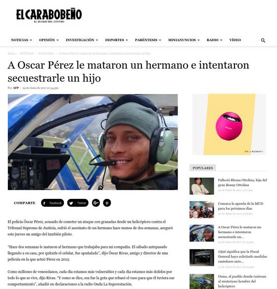 Le quotidien vénézuélien d'opposition El Carabobeño a également reproduit une dépêche de l'agence française l'AFP, qui montre comment la délinquance avait affecté Pérez en lui enlevant un frère et en séquestrant un de ses enfants. Une façon évidente de susciter de l'empathie et de la compréhension envers l'auteur d'un acte terroriste qui a souffert de la plupart des maux qui ont affecté la majorité des vénézuéliens, mais qui a décidé de faire quelque chose.