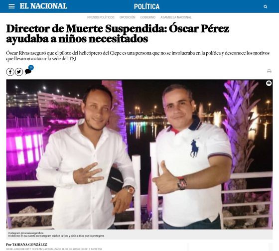 C'est ainsi que le décrit Oscar Rivas, réalisateur du fameux film, dans un article du quotidien El Nacional intitulé "Óscar Pérez aidait les enfants dans le besoin”, publié le 30 juin :