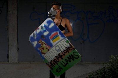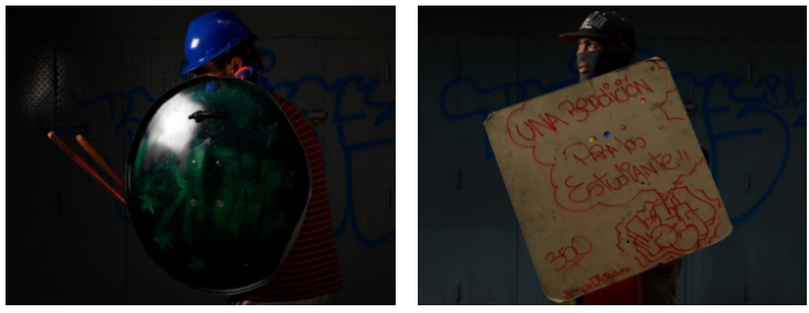 Sur l'une des photos, un jeune brandit un couteau de chasse. Sur une autre, une jeune fille arbore un bouclier avec le slogan « Miraflores en flammes », en référence au Palais Présidentiel vénézuélien, que l'on voit brûler sur un dessin du bouclier.