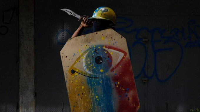 L'agence Reuters a organisé une séance photo à 23 "escuderos” (du mot escudo = bouclier) ou membres de la dénommée Résistance, des jeunes qui ont commis de graves délits sous couvert de leur « lutte » contre le gouvernement de Nicolas Maduro. "(Le palais présidentiel de) Miraflores en flammes”, dit ce bouclier. Photo: Carlos García Rawlins, Reuters.
