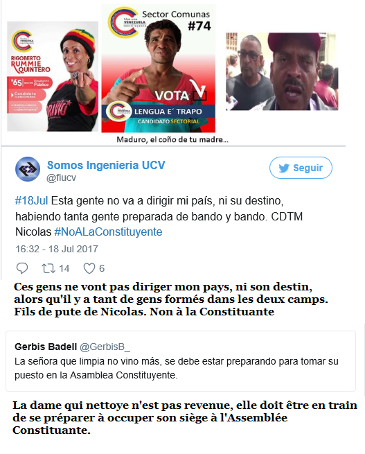 Alors que la gauche occidentale, par peur des retombées médiatiques, n'ose plus parler du Venezuela, l'ensemble des partis de la gauche et des mouvements sociaux d'Amérique Latine, manifestent de manière claire leur solidarité avec les jacobins noirs qui s'entêtent a vouloir écrire leur constitution à la barbe de l'empire états-uniens, de ses vassaux européens et de médias qui continuent à imputer les morts causées par les violences de la droite au « dictateur Maduro ». Cette lutte coloniale contre la démocratie se répète au Venezuela lui-même où une droite raciste qui s'inspire de plus en plus de l'État Islamique brûle vifs, comme hier encore à Lecheria, ceux qu'elle n'a jamais considérés vraiment comme des êtres humains depuis que Chavez les a fait entrer dans l'espace politique. Il suffit de lire les tweets de la droite sur les candidats à l'Assemblée Constituante, pour comprendre ce qu'elle ferait en cas de retour au pouvoir.