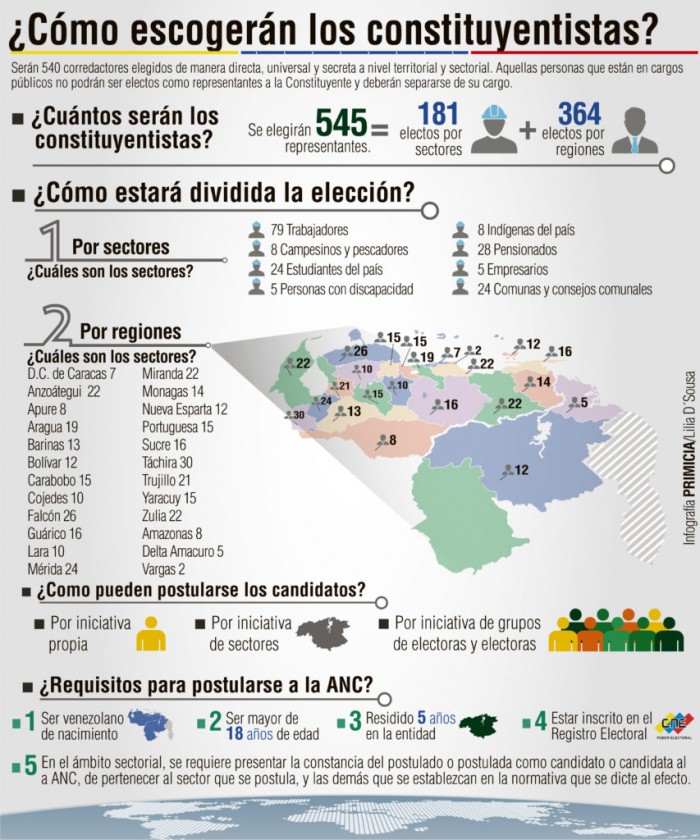 Les candidats à l' ANC seront élus dans leurs territoires et secteurs respectifs sous la supervision du CNE (Conseil national électoral, NdT), par le suffrage universel, direct et secret.