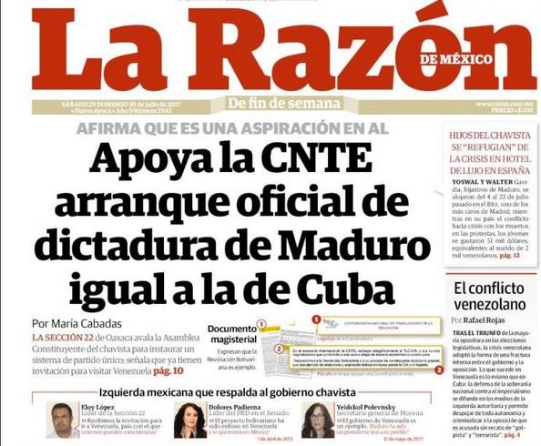 La Razón, Mexico: "Affirmant que c'est une aspiration en Amérique latine, La Coordination nationale des travailleurs de l'éducation appuie l'établissement official par Maduro d'une dictature identique à celle de Cuba" (la CNTE est le principal syndicat d'enseignants mexicain)