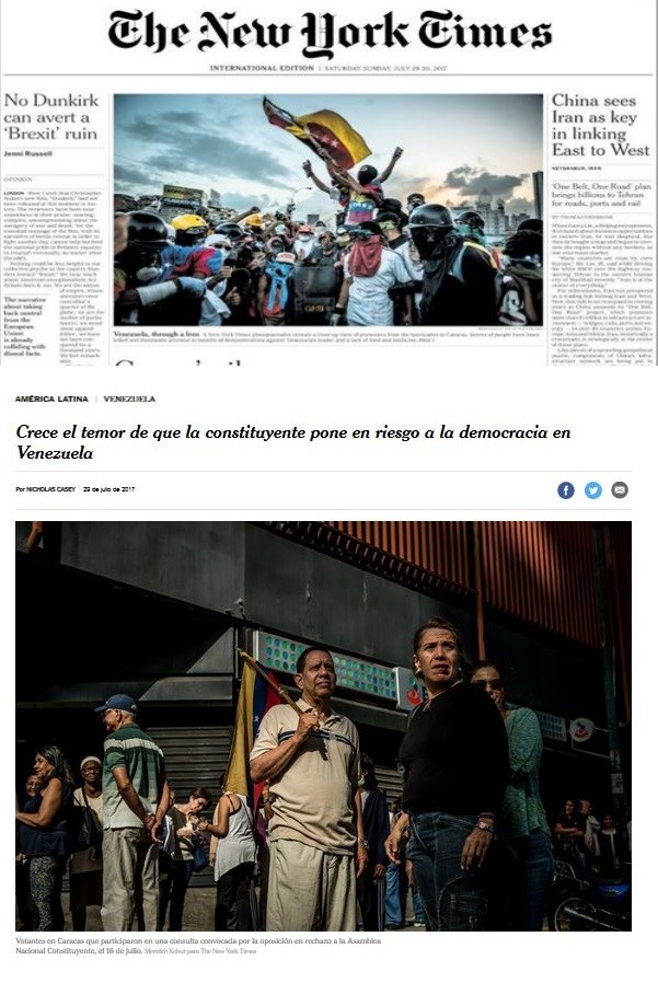 Le New York Times : "La crainte monte que la constituante met (sic) en danger la démocratie" (le New York Times tente d'écrire en espagnol, mais ignore -encore - l'usage du subjonctif)