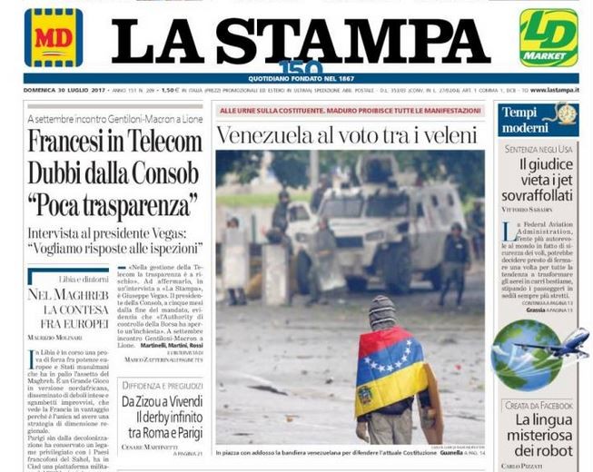 La Stampa, Turin, Italie: "Aux urnes pour la Constituante, Maduro interdit toutes les manifestations : le Venezuela vote entre les poisons" (sic)