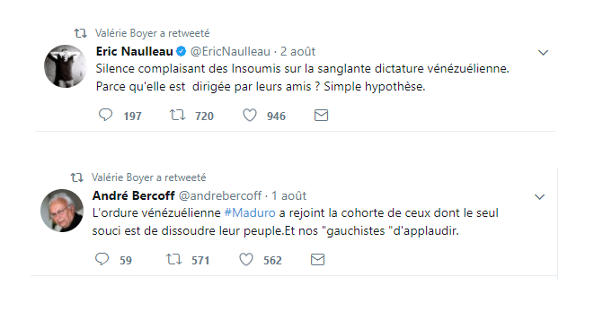 La députée (ex-filloniste) Valérie Boyer elle, a relayé des tweets dans lesquels le gouvernement du Venezuela est décrit comme une «sanglante dictature» et le président Maduro d'«ordure».