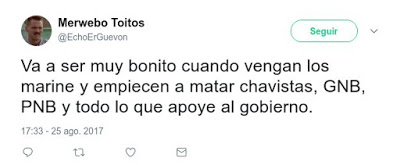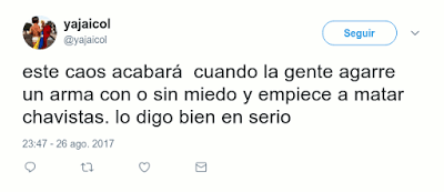 Ajoutons à tout cela les réseaux sociaux comme Twitter qui diffusent quotidiennement des messages appelant à tuer Maduro ou à tuer des chavistes (tweets relevés au hasard par le journaliste Luigino Bracci en août 2017):