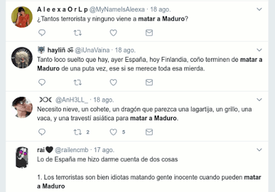 « Tant de terroristes de par le monde, et aucun pour tuer Maduro ? merde, tuez Maduro, c'est lui qui mérite toute cette merde. (..) Les terroristes sont des idiots, ils tuent des gens alors qu'ils pourraient tuer Maduro.