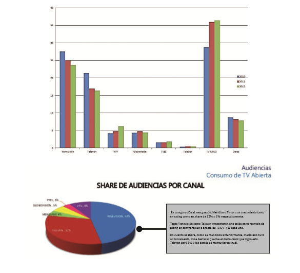 Hégémonie de l'audience par les télés privées (Televen, Meridiano, Globovision, Venevision, et chaînes payantes de TV par câble)