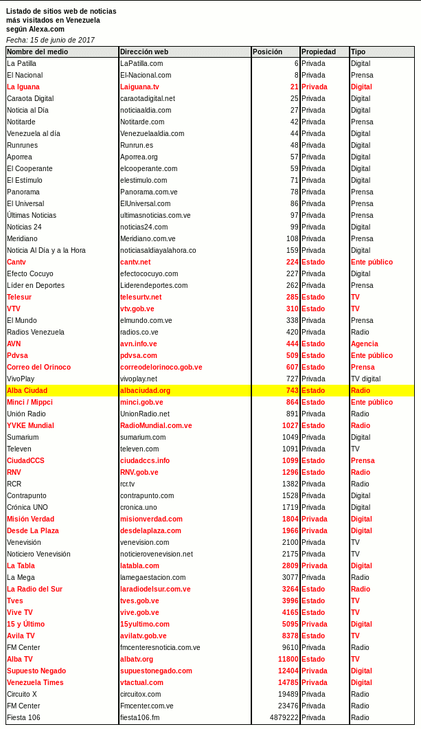 L'hégémonie de la droite en télévision et en radio vaut aussi pour la presse écrite et Internet. Ce dimanche 3 septembre 2017, on peut lire dans El Universal que « l'opposition exige le calendrier des élections régionales »: eluniversal.com, dans Tal Cual, que « le président Macri condamne l'interdiction de sortir du pays faite à Lilian Tintori » : talcualdigital.com, dans El Nacional, que « le SNTP dénonce que des journalistes subissent des intimidations via twitter pour leur travail sur les Comités d'Approvisionnement (CLAP) » : el-nacional.com, dans El Carabobeno que « Le gouvernement cherche à censurer internet », el-carabobeno.com, Etc... En ce qui concerne Internet, le tableau des sites d'information réalisé par Alexa.com montre que les deux sites les plus visités sont des sites d'opposition (La Patilla et El Nacional) et que sur la liste totale, 90 % des sites visités sont également d'opposition :