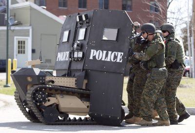 1. L'équipement, les appareillages : qui n' a pas remarqué ces dernières années que grâce en partie à un programme du Pentagone − qui vend des armes et de l'équipement venant directement des champs de bataille américains − les policiers dans nos rues ressemblent de moins en moins à de gentils policiers et de plus en plus à Robocop ou aux soldats lourdement armés et protégés de nos guerres lointaines ? Pensez à la puissance de l'armure et du feu, dans les rues de Ferguson, sur ces photos qui ont choqué et gêné tant d'Américains. Ou les conséquences de l'attentat tragique du marathon de Boston ? Watertown, dans le Massachusetts, ressemblait sûrement à Bagdad ou Kaboul occupés par l'Armée de terre, puisque la zone a été verrouillée et mise sous couvre-feu pendant la recherche des auteurs de l'attentat.