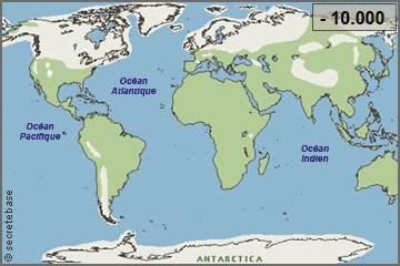 Les zones perpétuellement recouvertes de glace en 10000 av. J.-C. sont en blancs sur le planisphère.