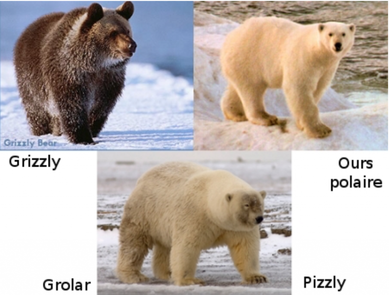 Grolar, hybridation entre un ours polaire et un grizzli.