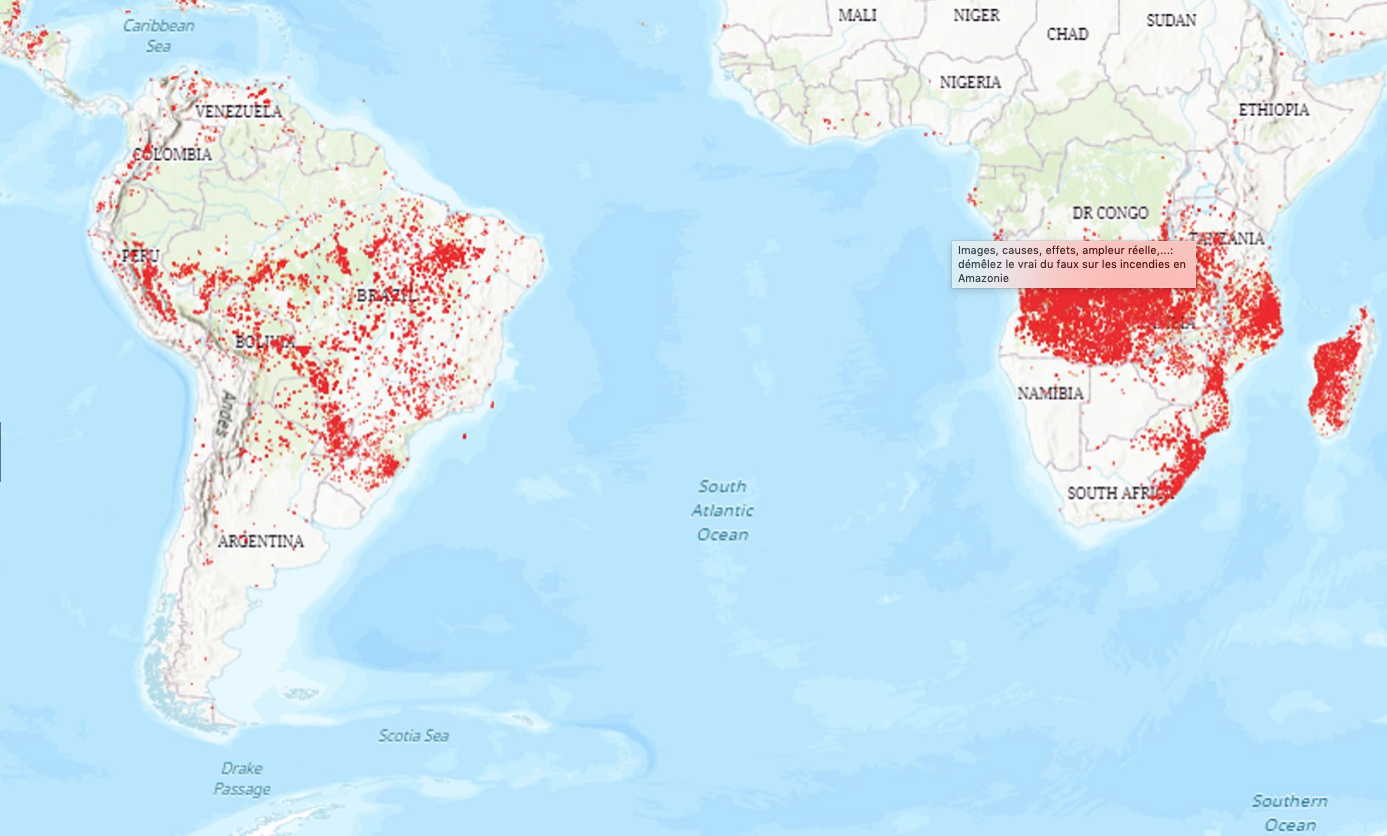 Une nouvelle fois, les cartes satellites sont parlantes : en ce moment, il y a plus d'incendies en Afrique subsaharienne et à Madagascar, qu'en Amazonie. Bloomberg a fait le décompte pour la période du 22 au 24 août : on dénombrait 6.902 incendies en Angola au cours des dernières 48 heures, contre 3.395 en République démocratique du Congo et 2.127 au Brésil.