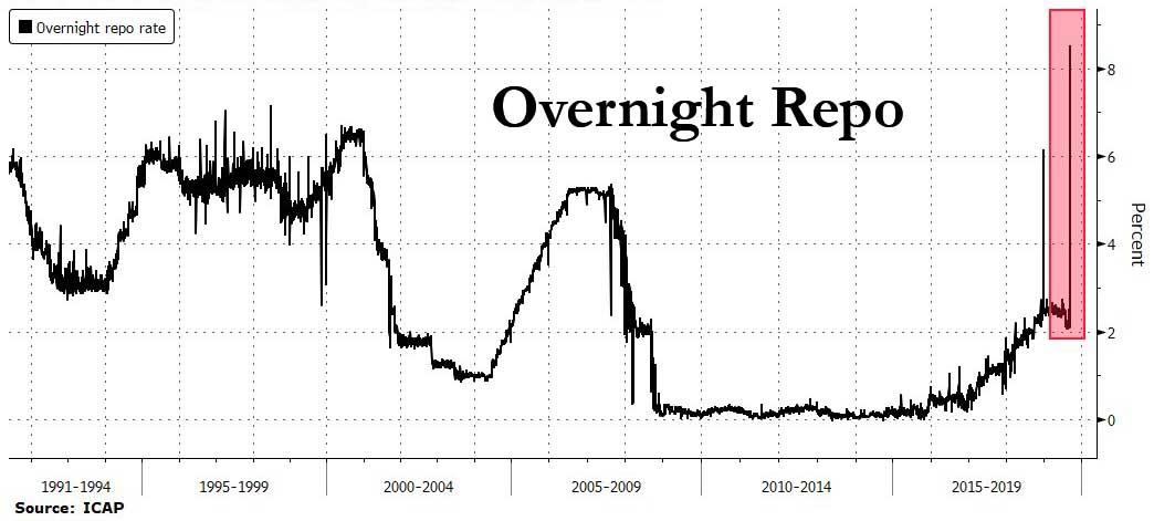 Son fonctionnement est le suivant : les banques et les sociétés de financement obtiennent des prêts au jour le jour en vendant temporairement des actifs tels que des bons du Trésor et des obligations à la Réserve fédérale avec la possibilité de les racheter le matin : « repo » signifie « rachat » [repurchase, NdT]. Comme ces actifs sont considérés comme parfaitement sûrs et non toxiques, le taux d'intérêt sur ces prêts à un jour tend à être très bas. Mais récemment, il a commencé à grimper jusqu'à 10 %, soit quatre fois plus que le taux fixé par la Réserve fédérale. Auparavant, il suivait toujours le taux préférentiel, alors il s'agit d'un tout nouveau développement.