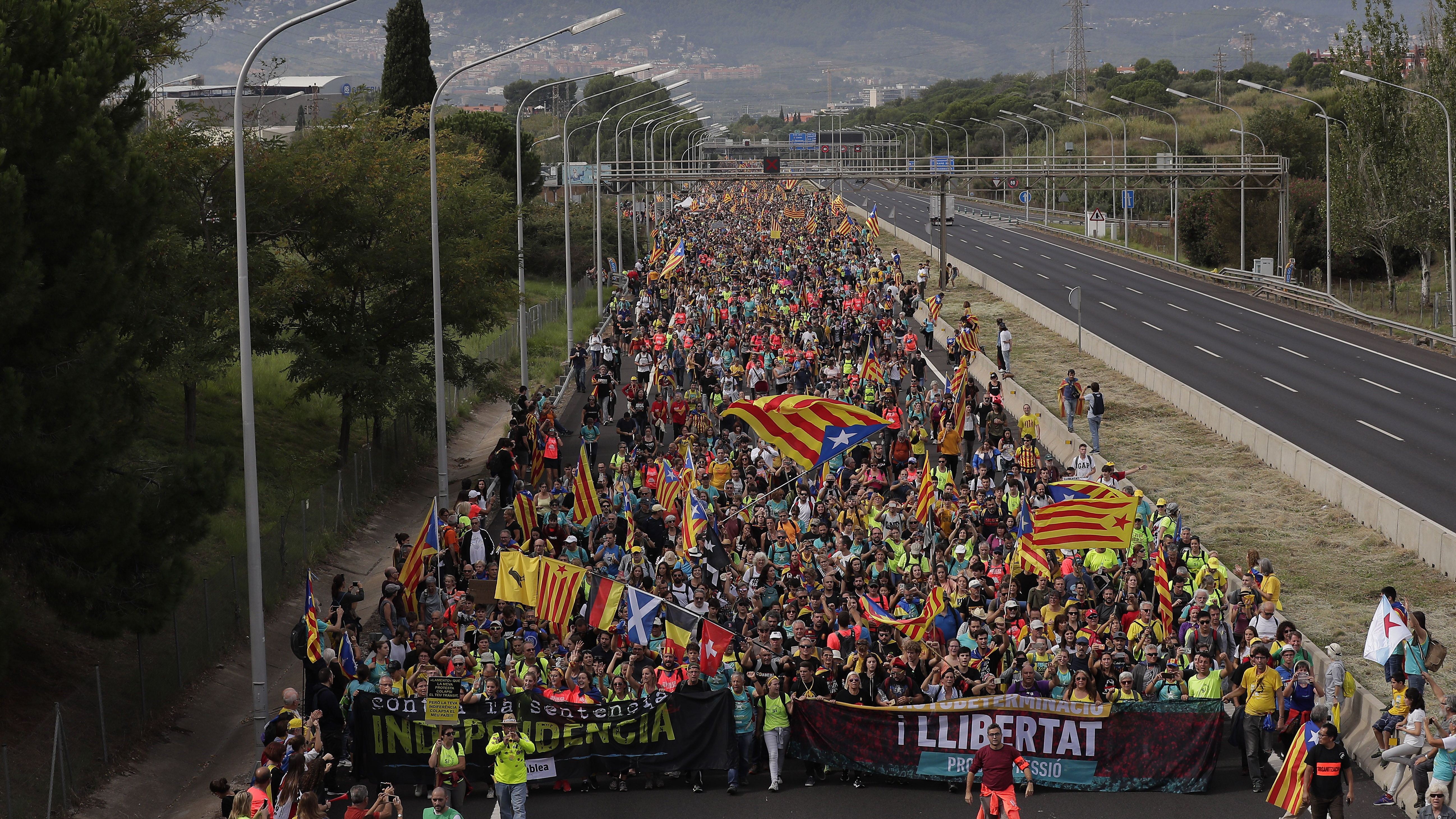 Au cours de la matinée, cinq colonnes de milliers de manifestants, organisées par les associations l'Assemblée nationale catalane (ANC) et Omnium culturel sous le slogan «Marche pour la liberté», ont bloqué les autoroutes menant à Barcelone. Les colonnes ont commencé à Vic, Berga, Tàrrega, Girona et Tarragone et ont convergé vers Barcelone dans l'après-midi, où des dizaines de milliers d'autres personnes s'étaient rassemblées. Les manifestants portaient une banderole géante, en anglais: «Free Catalan Prisoners Now» (Libérez les prisonniers catalans maintenant).