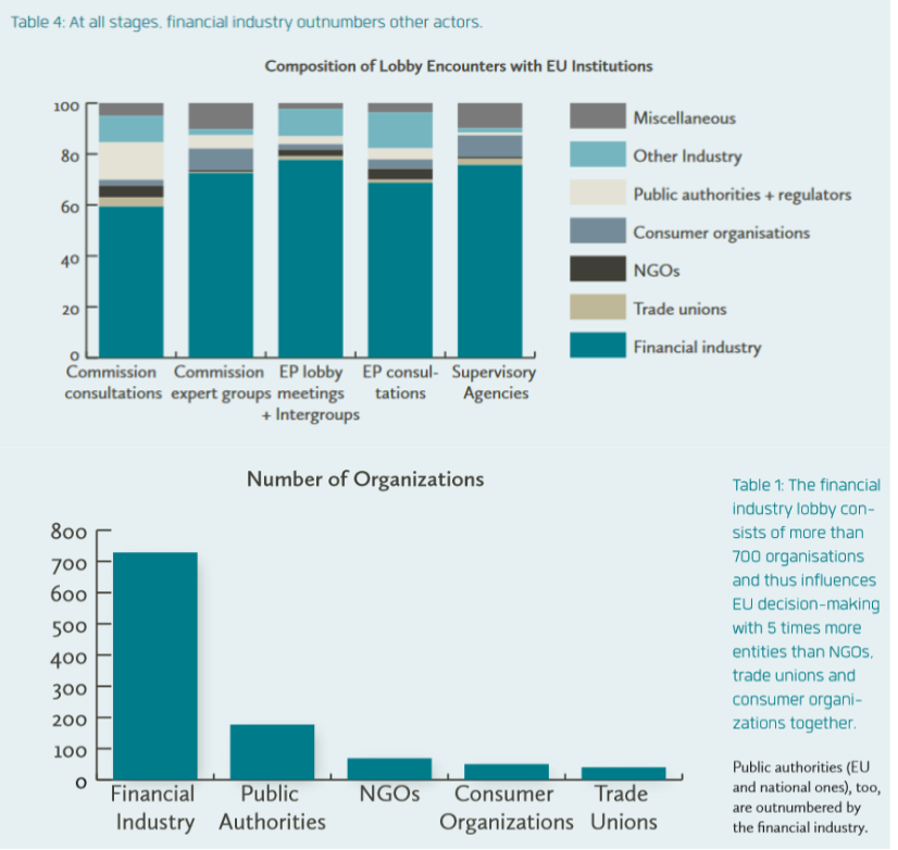 Voici quelques graphiques tirés d'une étude sur les lobbies de la finance à Bruxelles. Nous y voyons la puissance de la pénétration de l'espace dirigeant européen. Ceci a fait dire à certains que l'Union européenne est l'espace politique de la haute finance internationale.Rencontres et séances se tiennent sur des bases régulières entre les représentants politiques et ceux qui défendent les intérêts du marché.