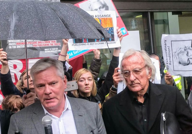 Pilger a déclaré aux manifestants: «Tout cela est une absurdité grotesque. Il existe une loi sur l'extradition entre ce pays et les États-Unis. Elle précisé que personne ne peut être extradé si les infractions sont de nature politique... Ce n'est pas un brin de propagande, ce n'est pas une opinion, elles sont politiques. Toutes les accusations sauf une sont fondées sur la loi de 1917 sur l'espionnage, utilisée pour incarcérer des objecteurs de conscience pendant la Première Guerre mondiale aux États-Unis.»