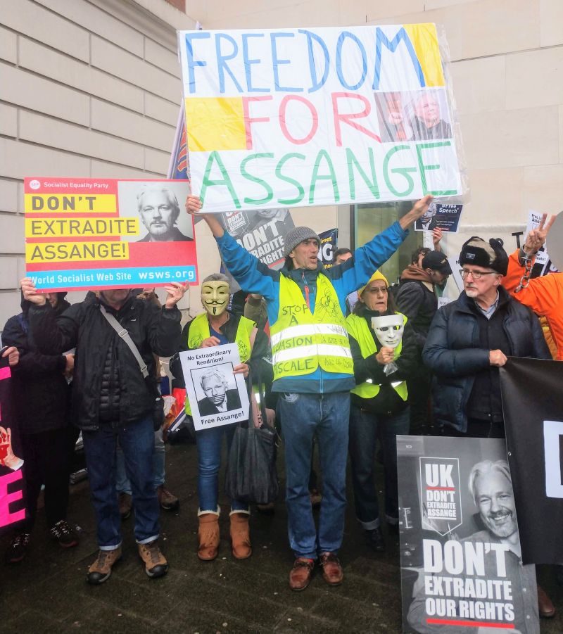 Hrafnsson et Pilger se sont adressés aux 200 manifestants devant le tribunal qui avaient fait sentir leur présence toute au long de la matinée. La foule comprenait des dizaines de Gilets jaunes qui avaient fait le déplacement dans la nuit en autocar depuis la France.