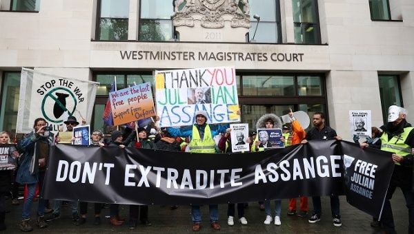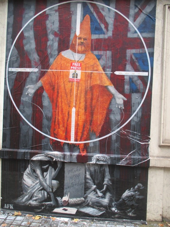 Ayant démonté l'implacable machine, nous avons décidé de la gripper et c'est ainsi que je me suis déplacée à Londres pour assister à toutes les quatre audiences d'extradition de la Westminster Magistrate Court du 20 septembre au 21 octobre dernier. Au passage j'ai beaucoup appris sur les compagnons d'infortune et de circonstance de Julian Assange - les extradés polonais et autres est-européens, jugés en leur absence, sans avocats et sans interprète, souvent sans comprendre ce qui se passe sous le regard résigné de leurs familles muettes dans le public. La vie du prolétariat est-européen émigré en Grande-Bretagne défilait sous mes yeux alors que j'attendais que l'administration britannique appelle le prisonnier Julian Assange à la barre. À force de protester contre les nombreuses violations de droits, les lettres qui n'arrivent jamais, les colis non livrés, les protestations auprès de l'administration pénitentiaire sans réponses, nous avons enfin obtenu l'inespéré : la « justice » britannique a été obligée de présenter l'homme Assange physiquement. De prouver qu'il n'a pas encore été assassiné à force de tortures. Car elle en a la responsabilité pénale, l'administration britannique, puisqu'il est privé de liberté et enfermé dans ses prisons. La torture est un crime voyez-vous, et les assassinats extrajudiciaires aussi. On peut échapper aux molles remontrances d'un comité de l'ONU mais sur le long terme, la colère du peuple peut être terrible. Les Gilets Jaunes prenant d'assaut le fourgon policier transportant Julian Assange donne aux élites anglaises un avant -goût de ce que peut être la Révolution.