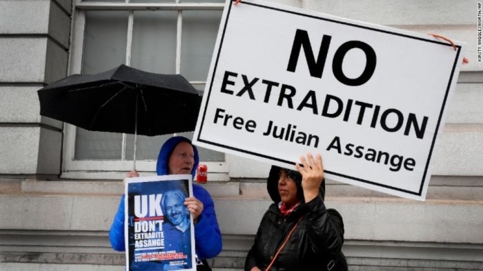 Lorsque nous arrivons devant le tribunal, surprise, environ 50 personnes font déjà la queue pour rentrer. D'autres préparent panneaux, banderoles et pancartes à l'effigie de Julian Assange. C'est sympathique jusqu'à ce que je comprenne que l'organisation en commando sert à permettre aux « personnalités » de l'affaire, arrivées en retard, à se retrouver en reines de la resquille tout en haut de la file devant les autres et donc devant nous au risque de nous empêcher de rentrer au tribunal et d'assister à l'audience. Ainsi, Kristinn Hrafnsson et Craig Murray (lire son compte-rendu de l'audience ici) arrivent bien après moi mais une militante cède sa place et ils se retrouvent, sans même la remercier, tout près de la porte. Il en sera de même dans la salle d'audience. La militante qui se fait appeler « Greekemmy » sur les réseaux sociaux régente un groupe de femmes « petites mains » qui occupent les sièges mais cèdent leur place au gré de l'arrivée « d'hommes importants » comme John Pilger, Ken Livingstone, Vaughan Smith puis même Juan Branco et Maxime Nicolle bien plus tard. Il suffit que Greekemmy crie « substitution » et immédiatement une femme se lève et donne sa place. Je ne trouve pas ce procédé honnête et il est illégal. Tout le monde a le droit de venir assister à une audience publique et une personne lambda ne peut pas s'arroger le droit de décider qui peut rentrer dans un tribunal et qui non. Même en Pologne on n'accepterait pas cela. D'autant plus que Greekemmy fait pire : lorsqu'elle aperçoit dans le couloir du tribunal ou dans la salle d'audience une personne qu'elle ne connait pas, d'autorité elle exige de connaitre son nom et ses coordonnées comme si elle était la police en personne. Or, il est illégal de stocker les données privées de personnes rencontrées dans un lieu public en se faisant passer pour une autorité compétente. Encore une des nombreuses bizarreries du dossier Assange qui a des conséquences, puisque les citoyens sont ainsi découragés d'assister aux audiences ou il est jugé...
