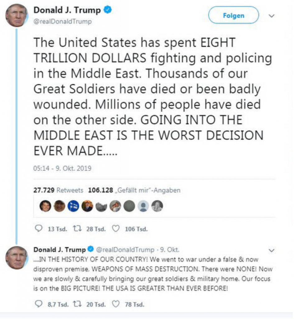 «The United States has spent EIGHT TRILLION DOLLARS fighting and policing in the Middle East. Thousands of our Great Soldiers have died or been badly wounded. Millions of people have died on the other side. GOING INTO THE MIDDLE EAST IS THE WORST DECISION EVER MADE IN THE HISTORY OF OUR COUNTRY! We went to war under a false & now disproven premise, WEAPONS OF MASS DESTRUCTION. There were NONE! Now we are slowly & carefully bringing our great soldiers & military home.»