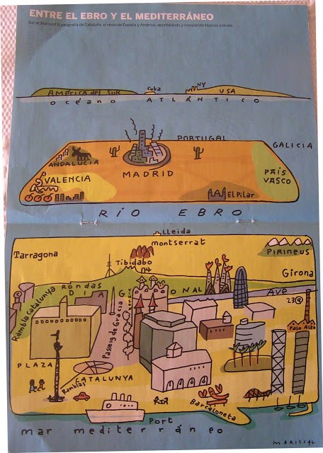 La propagande anticatalan(ist)e prend de formes perverses et sournoises, comme ctte "carte mentale" de la vision du monde qu'auraient les Catalans, selon le dessinateur (lui-même Catalan, de Valence) Javier Mariscal, auteur de la mascotte des Jeux Olympiques de 1992. Dessin paru dans El País en 2010