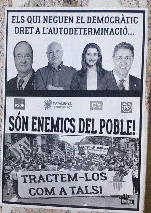 "Ceux qui dénient le droit démocratique à l'autodétermination sont des ennemis du peuple ! Traitons-les comme tels !": cette affiche placardée par des inconnus à Lleida en 2017 a suscité les foudres du procureur, qui a ouvert une enquête pour "apologie du crime". Les suspects courent toujours