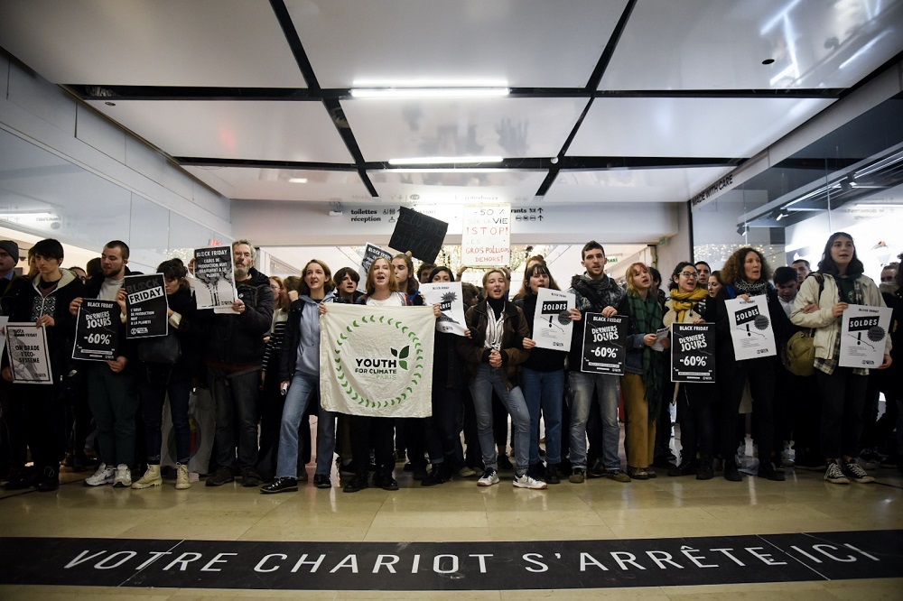 Paris La Défense, 12 h 20 Les tensions sont toujours très vives, les clients en viennent au main pour passer les lignes de blocage et poursuivre leurs achats. « Non violents ! », crient les activistes. « Ils sont pénibles, trente minutes qu'on attends », dit une cliente, qui ne comprend pas pourquoi « ces quelques bobos » la « privent de se déplacer comme [elle] l'entend ». Un mur d'incompréhension se dresse entre les « Black Friday » et les « Block Friday ». « Écologie libérale, enfant du capital », chantent les militants. « Mais qu'est-ce qu'ils racontent ceux là ? » rigole un couple, qui filme la scène. « Et un et deux et trois degrés », embrayent les activistes, dont une bonne partie sont mineurs. Fatigués d'être bousculés, ils laissent désormais passer les consommateurs.
