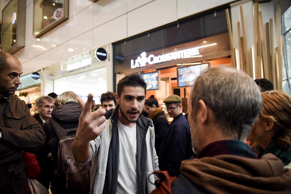Paris La Défense, 11 h 50 Au cœur du centre commercial, une trentaine d'autres activistes bloquent le passage des clients. Un livreur, avec un chariot, perd patience : « Je suis payé au rendement, mon temps c'est de l'argent, ce que vous faites me mets en danger. » Il s'emporte et lance son charriot sur la ligne d'activiste avant de faire demi-tour. Les boutiques du cœur du centre commercial (Adidas, Flying Tiger, Orange...) sont fermées.