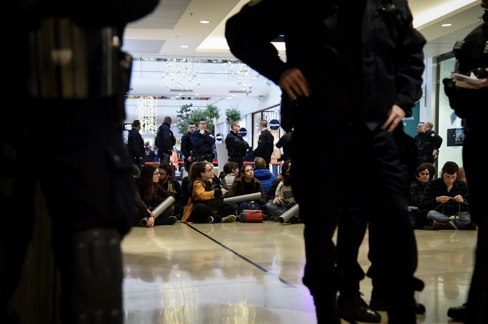 Paris La Défense, 15 h 50 Près de 200 militants se déplacent, ensemble, dans les allées du centre commercial, en chantant. En passant, ils forcent les boutiques à baisser leur rideau.