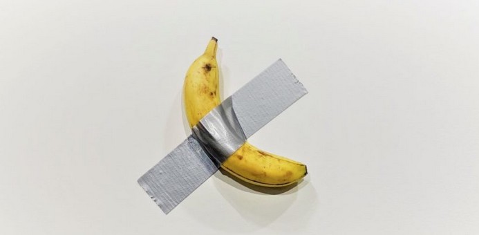Photo : dans un symbole saisissant des priorités de la gauche libérale actuelle, cette oeuvre d'art contemporain, une banane scotchée à un mur, s'est vendue 120 000 dollars. Elle a été décrite comme « la plus grande oeuvre d'art depuis La Joconde » (sic).