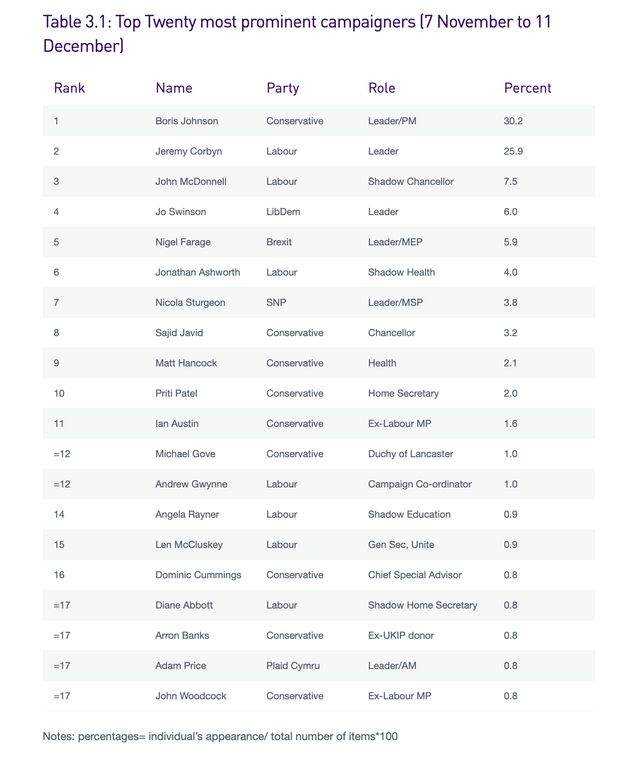 According to the university's analysis, prime minister Boris Johnson was the most prominent campaigner, attracting almost a third of coverage (30.2%).