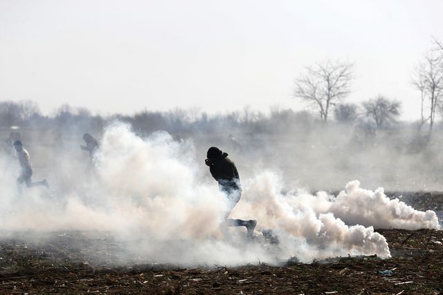 Migranter løper for å unngå gresk politis tåregass, under sammenstøt nær grenseovergangen Pazarkule i Edirne, ved den tyrkisk-greske grensa, mandag 2. mars 2020. [Foto: AP Photo/Darko Bandic]