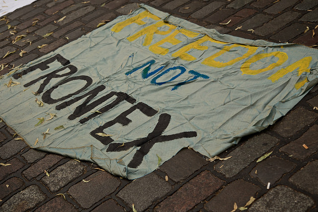La rhétorique des différents représentants de l'UE correspond parfaitement à une approche de la politique européenne de gestion des frontières qui est consubstantielle à l'agenda politique néolibéral. D'un côté, elle promeut des politiques d'ajustement structurel dans les pays du Sud, ce qui augmente leur dépendance vis-à-vis des pays du Nord. De l'autre, elle responsabilise et pointe du doigt ces mêmes pays pour la gestion des différentes crises qu'ils traversent (économiques et sociales), mais aussi les personnes migrantes accusées de provoquer et d'exacerber les crises des pays européens. Il s'en suit la criminalisation des personnes migrantes et la militarisation des frontières. L'agence Frontex, responsable de coordonner la « protection » des frontières européennes, a vu son budget flamber de 6 à 330 millions d'euros entre 2005 et 2019. Cette impressionnante augmentation montre bien la place que les politiques de contrôle des personnes migrantes occupent dans l'UE actuelle. Ceci se traduit tout d'abord par le renforcement des frontières physiques, par le biais de murs et barrières sur au moins 990 km, et la dotation de moyens de surveillance de haute technologie. Il s'agit de frontières véritablement militarisées, qui cherchent à « protéger » le sol européen à l'image d'une cité assiégée par des « barbares ».