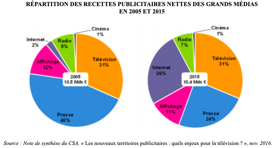 Le marché de la publicité est par nature instable, et bien avant la crise actuelle, l'avènement du numérique avait déjà déplacé les investissements publicitaires de la presse vers le numérique, mettant en difficulté tous les organes de presse dont le modèle économique reposait en grande partie sur la publicité : malgré un budget global de publicité qui reste stable (10 Mds d'euros de publicité « média » par an en France), la moitié des financements publicitaires qui allaient à la presse ont été reportés vers le numérique, qui passe de 2 % à 26 % de parts de marché, tandis que la télévision, la radio et l'affichage restent stables.