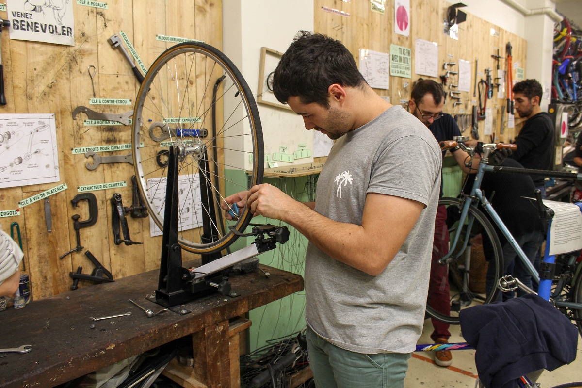 Les ateliers d'auto-réparation de vélo, de plus en plus nombreux en France, sont souvent dans des locaux étroits. Afin de préserver leur activité et une distanciation sociale nécessaire au moment du déconfinement, les associations espèrent réquisitionner des plus grands locaux, voire avoir l'autorisation d'exercer sur la voirie ou dans des espaces publics. Photo prise en décembre 2019. © Justine Guitton-Boussion pour Reporterre