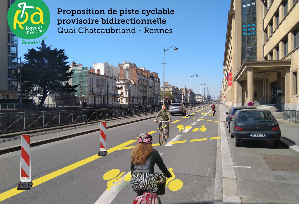 L'association rennaise Rayons d'action a créé des photomontages en imaginant à quoi ressembleraient les pistes cyclables provisoires dans la ville. Outre les aménagements, les associations demandent une réduction de la vitesse automobile en ville et des programmes pour accompagner la pratique (vélo-école, aide financière pour acheter une bicyclette...). Crédit : Rayons d'action Rennes