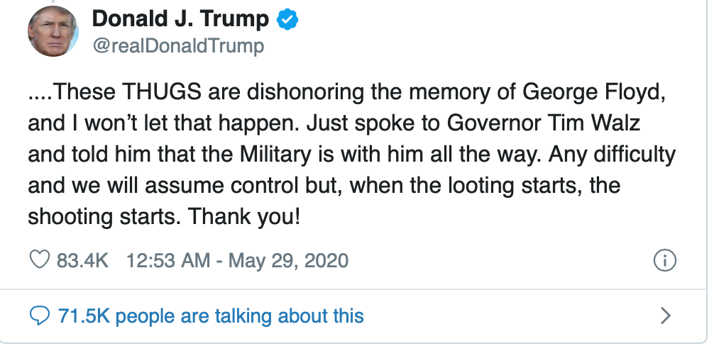La semaine dernière, il a enflammé les choses en tweetant : « Quand le pillage commence, les tirs commencent. »