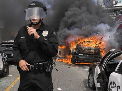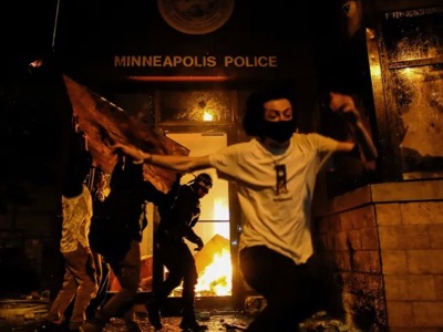 Des émeutiers blancs incendient un poste de police à Minneapolis à l'occasion du lynchage du noir George Flyod par un policier blanc.