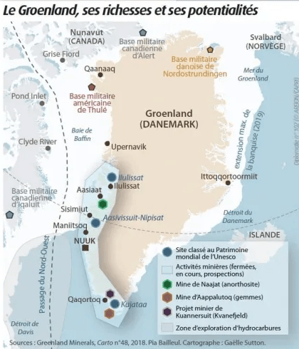 Les États-Unis y possèdent déjà plusieurs bases militaires non divulguées, à l'exception de celle, bien connue, de Pituffik, qui est le centre de l'ensemble du réseau de protection de l'espace (NORAD). Au-delà des ressources, certes substantielles, il ne fait aucun doute que le principal poids stratégique de l'île glacée est d'ordre géostratégique, puisqu'elle fait partie du pôle Nord et qu'elle en contrôle l'accès pour tout le Sud-Ouest.