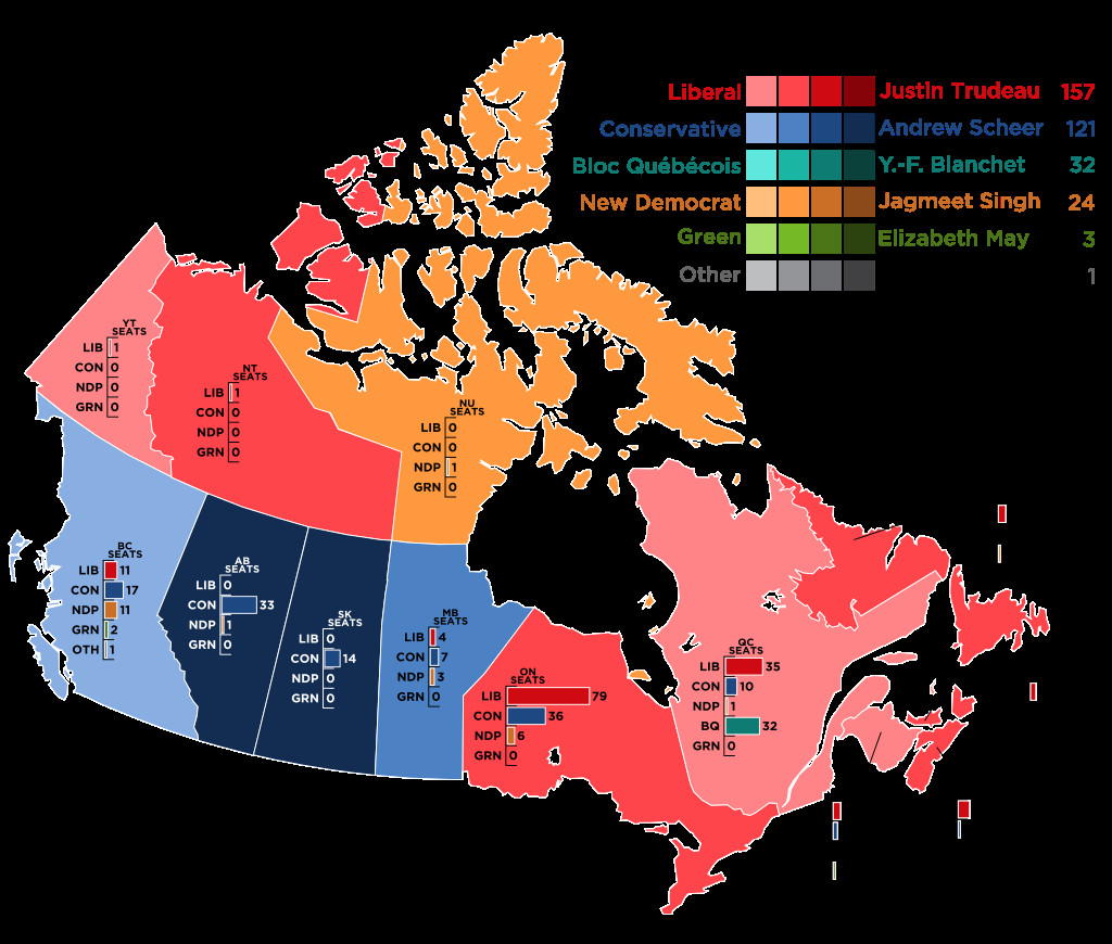 Here, for example, are the 2019 election results for Parliament. (In Canada, blue is the color for the Conservative party.):