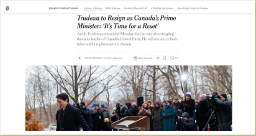 « Il est temps de tout remettre à zéro », a déclaré Trudeau, ajoutant : « Je pense vraiment que l'élimination de la controverse autour de mon propre leadership est une occasion de faire baisser la température. ». (…) « Il est devenu évident pour moi, avec les batailles internes, que je ne peux pas être celui qui portera l'étendard libéral aux prochaines élections. »