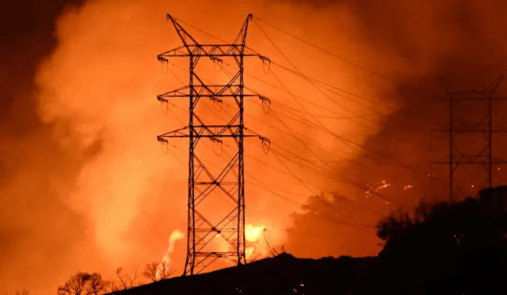 illustration : Des flammes et de la fumée sont visibles près des lignes électriques alors que l'incendie des Palisades se développe près du quartier de Mandeville Canyon et d'Encino, en Californie, le 11 janvier 2025. L'incendie de Palisades, le plus important des incendies de Los Angeles, s'est propagé vers des quartiers jusque-là épargnés le 11 janvier, obligeant à de nouvelles évacuations et réduisant les espoirs de maîtrise de la catastrophe. Dans toute la ville, au moins 16 personnes ont trouvé la mort dans les multiples incendies qui ont ravagé des zones résidentielles depuis le 7 janvier, rasant des milliers d'habitations dans une destruction que le président américain Joe Biden a comparée à une «scène de guerre».