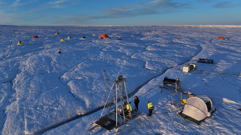 Des scientifiques et des ingénieurs surveillent un forage sur le glacier Isunnguata Sermia, le 9 juillet 2024, dans l'ouest du Groenland.
