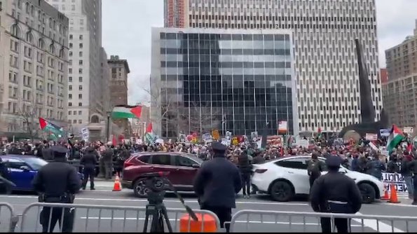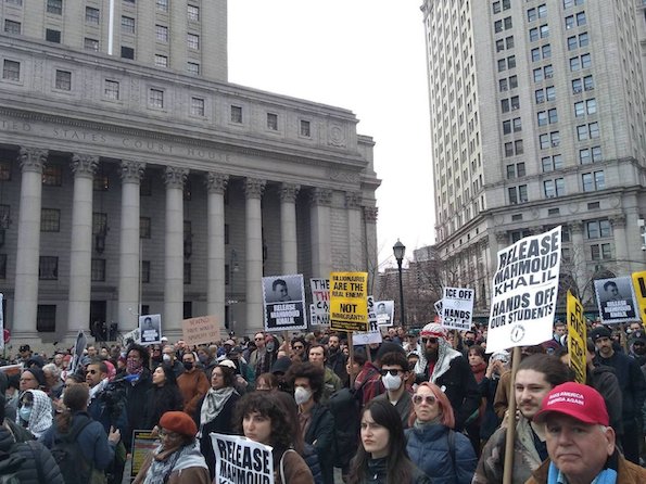 Des centaines, sinon des milliers de manifestants se sont rassemblés mercredi devant le palais de justice de New York avant l'audience du militant palestinien et diplômé de l'Université de Columbia Mahmoud Khalil, qui a été arrêté à son domicile en raison de son activisme au sein du mouvement étudiant pro-palestinien.